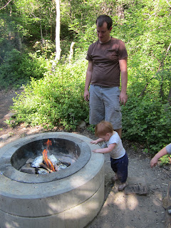 We borrowed a tent and sleeping bag from some friends, and we were all packed and ready to go by noon yesterday. We were going to go to place two hours away but at the last minute we saw that there were openings at a much closer and nicer spot... Mt. Timpanogos just past Aspen Grove and Sundance. Luckily there was an opening, usually it fills up fast. We had foil dinners and s'mores for dessert. Rylee explored the area and got massively dirty! Joseph carried his 'pooh bear" {not actually pooh, but that's what we calls him} EVERYWHERE. Come bedtime we realized we would have to be in bed with the kids to get them asleep. It was actually kind of fun just rolling around on the air mattress singing and telling bigfoot stories. And in good Schultz family camping tradition we even checked out