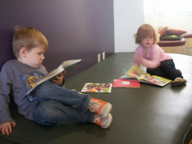 I am always amazed at Joseph's sociability - because of mine and Cody's lack thereof. I can say for my part that I LOVE people and love to be around them...but when it comes to talking to them.... yeah, I am inept. Joseph is a pro at using the Library. I don't even know where he learned it but I love how if he ever needs to find a book he runs right up to the desk and asks he librarian for help. I usually try to avoid Librarians and find books myself... not Joseph, somehow he knows that's what she is there for! It is so adorable! I feel too tired to rush the kids out the door and to our house. The Library is great and making you want to read... once we are home it can be a little harder to sit down and read. So, after we get our books we always go to the same corner of the juvenile section and cozy up together and look though and read books. I love the Library!